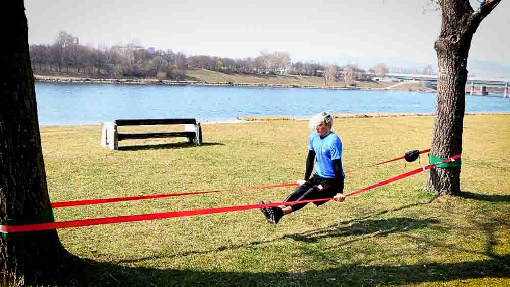 A challenging exercise session that involves advanced slacklining techniques to engage and strengthen the entire body, including core stability, upper body strength, and lower body control.